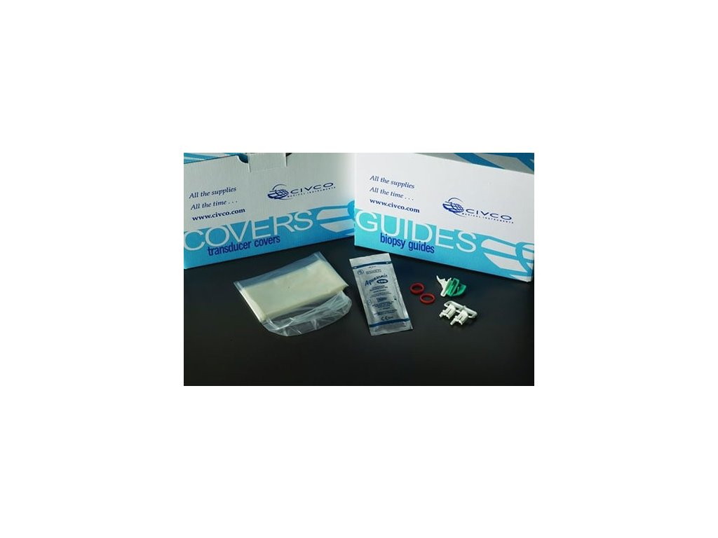 Sterilní Ultra-Pro 3 bioptický kit. Balení obsahuje 24 ks sterilně balených sad: vodiče jehly pro velikosti 8,5FR, 11-22 GA (kromě 19,21 GA), ochranné teleskopicky skládané návleky CIV-Flex (3D) 14 x 91,5 cm, ultrazvukový gel Aquasonic 100 a barevné elastické pásky na uchycení. Ultra-Pro 3 náhradní jednorázové bioptické kity pro Ultra-Pro nebo Ultra-Pro II bioptické nástavce. Použití v případech, kde se užije technika "volné ruky". Nulový odpor jehly pro hladký pohyb. Snadno oddělitelné pro rychlé použití.Doplňkové parametry